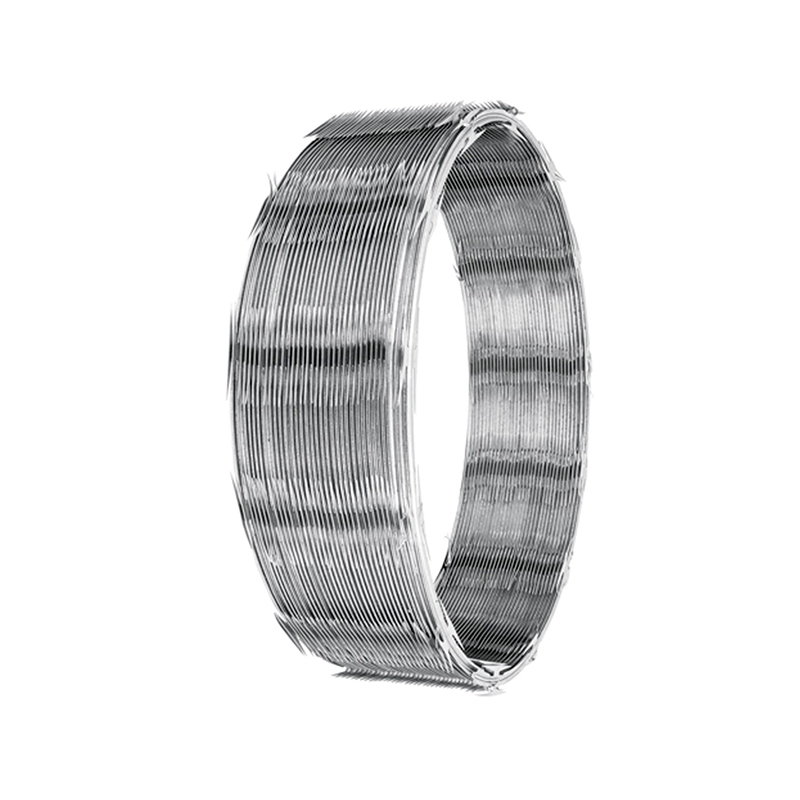 Cintilla metálica galvanizada su contorno cuenta con navajas altamente punzo cortantes espaciadas una de otra y sirve como protección complementaria para cualquier tipo de malla, muros y diversas áreas vulnerables en donde se requiere una protección extrema.